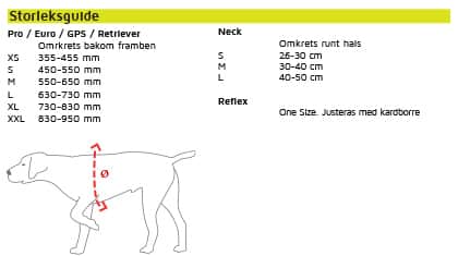 Västen finns i 6 standardstorlekar från XS till XXL, alla våra jakthundar, oavsett ras passar västen. Från korta gråhundar till långa stövare, måttet som avgör storleken är omkrets bakom bog.